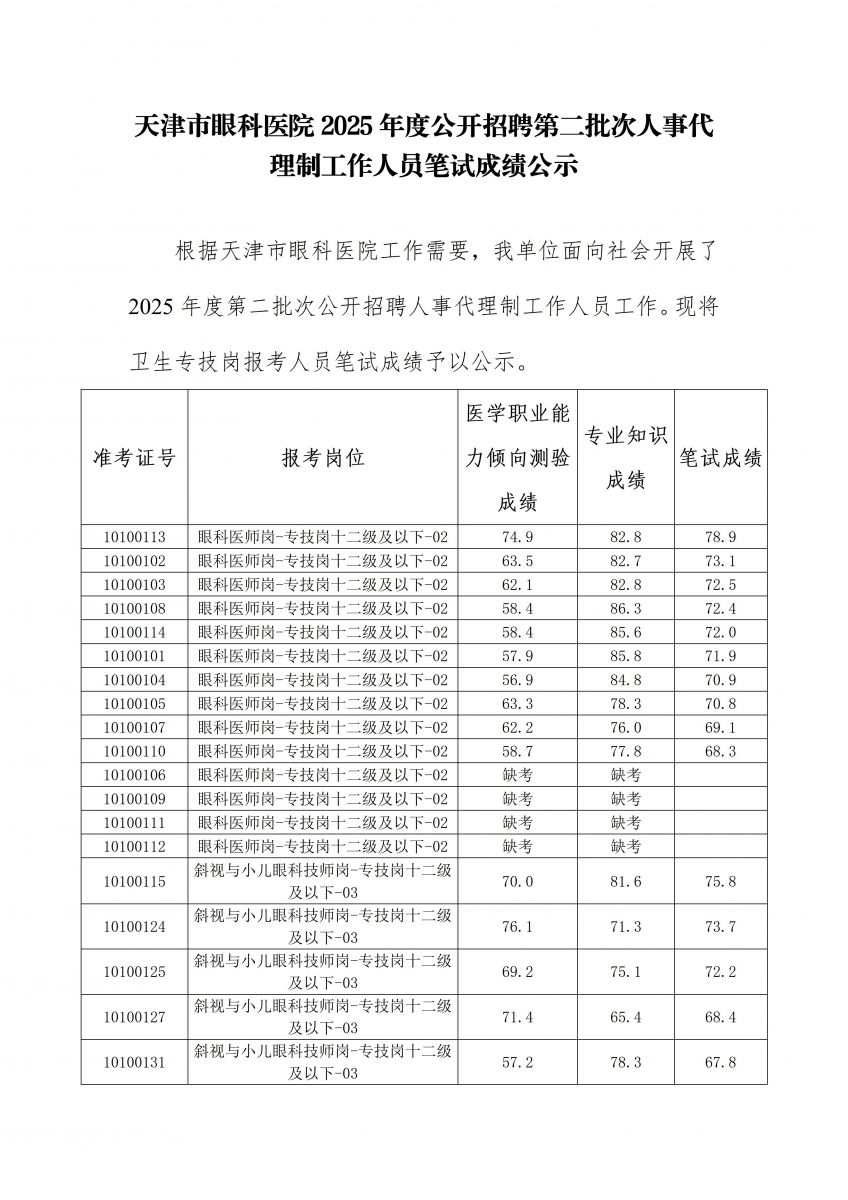 天津市眼科医院2025年度公开招聘第二批次人事代理制工作人员笔试成绩公示