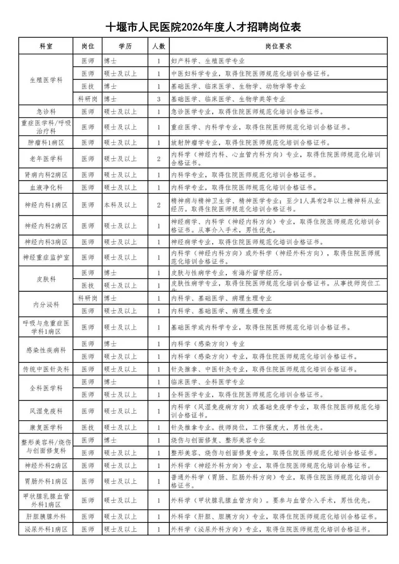 4.招聘岗位条件详见《十堰市人民医院2026年人才招聘岗位表》,急需紧缺专业人才可适当放宽条件。