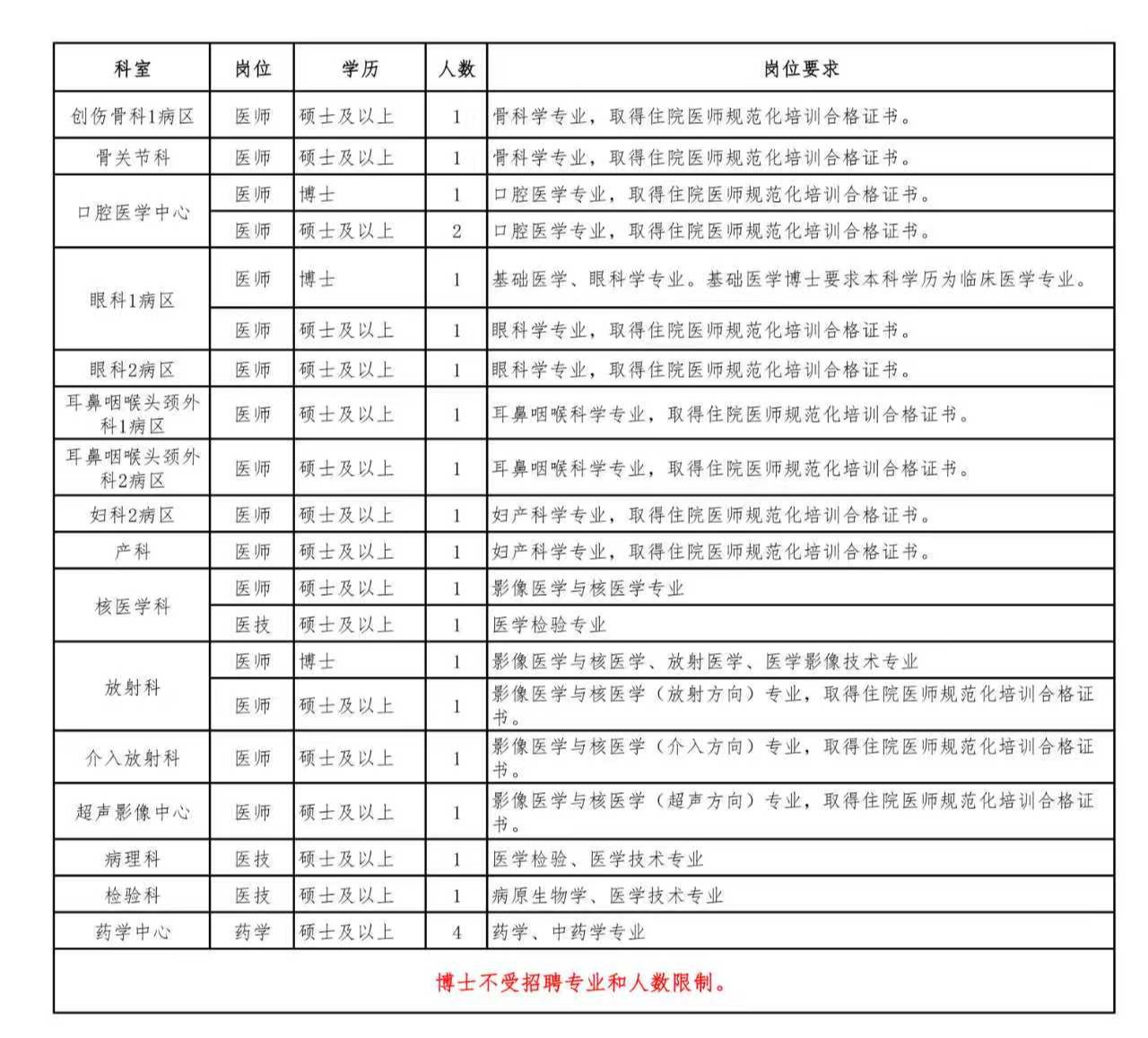 3.临床医师岗位需取得医师执业资格证(首次考试通过,资格审核时提供首次考试合格成绩单);专业型硕士研究生需取得住院医师规范化培训合格证(应届毕业生入职时提供通过住院医师规范化培训考试合格证明)。