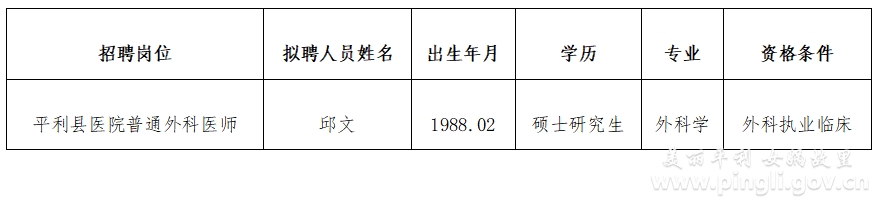 根据《2025年平利县事业单位公开招聘高层次人才公告》,经报名、资格审查、面试、体检、考察等环节,现将拟聘用人员(详见附表)予以公示。公示时间:2026年1月15日至1月21日。公示期间如有异议,请及时向平利县人社局反映。