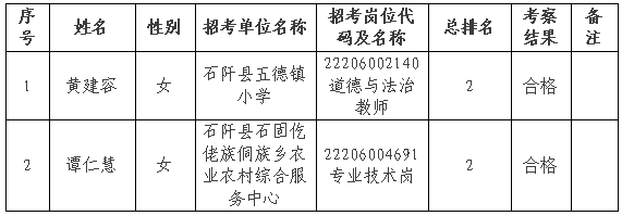 根据《2025年石阡县事业单位公开招聘工作人员实施方案》有关规定,经过报名、笔试、资格复审、面试、体检和考察程序,现将拟聘用人员(第六批)进行公示如下: