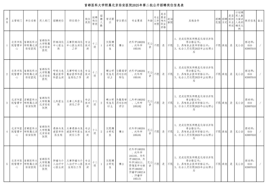 附件:首都医科大学附属北京佑安医院2025年第二批公开招聘岗位信息表