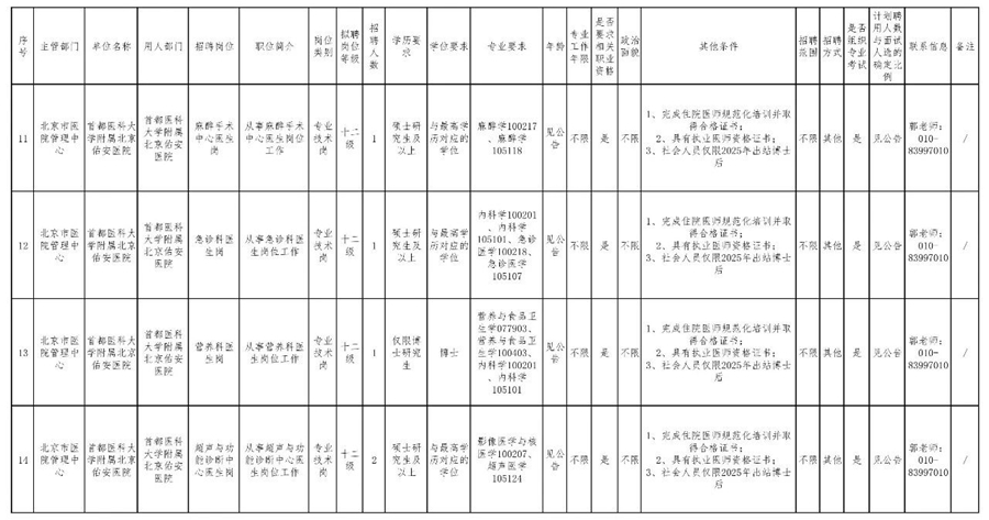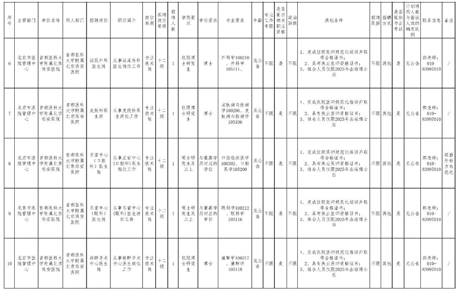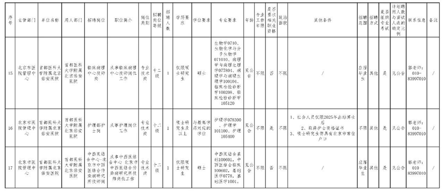 详情可登录北京市人力资源和社会保障局官网(https://rsj.beijing.gov.cn/xxgk/gkzp/202502/t20250221_4016482.html)和首都医科大学附属北京佑安医院官网(https://www.bjyah.com/Html/News/Articles/47112.html)查看