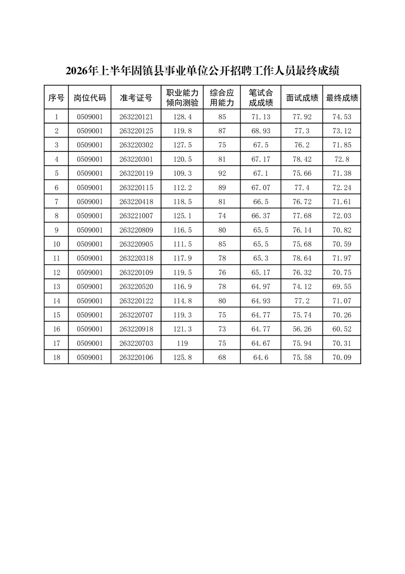 2026年上半年固镇县事业单位公开招聘工作人员最终成绩
