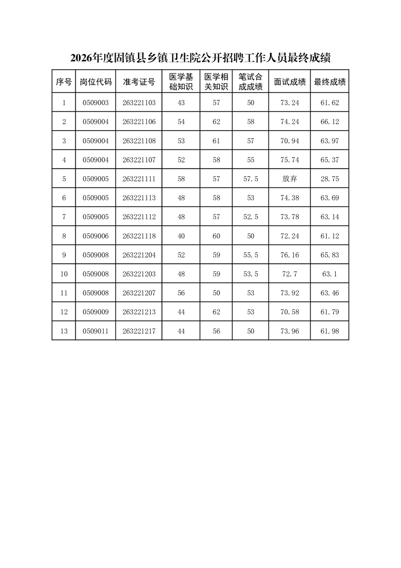 2026年度固镇县乡镇卫生院公开招聘工作人员最终成绩