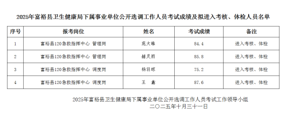 按照《黑龙江省事业单位公开招聘工作人员实施细则》(黑人社发〔2014〕63号)和《2025年富裕县卫生健康局下属事业单位公开选调工作人员公告》第五条,本次考试采取笔试与面试相结合的方式,如报考人数与拟选调人数不达1:3比例将直接进行面试。截止2025年8月22日报名结束,符合报名要求共计4人。因报考人数与拟选调人数未达到1:3比例,根据公告要求取消笔试环节,以上4人直接进入面试。现将考试人员成绩及拟进入考核、体检人员予以公示。