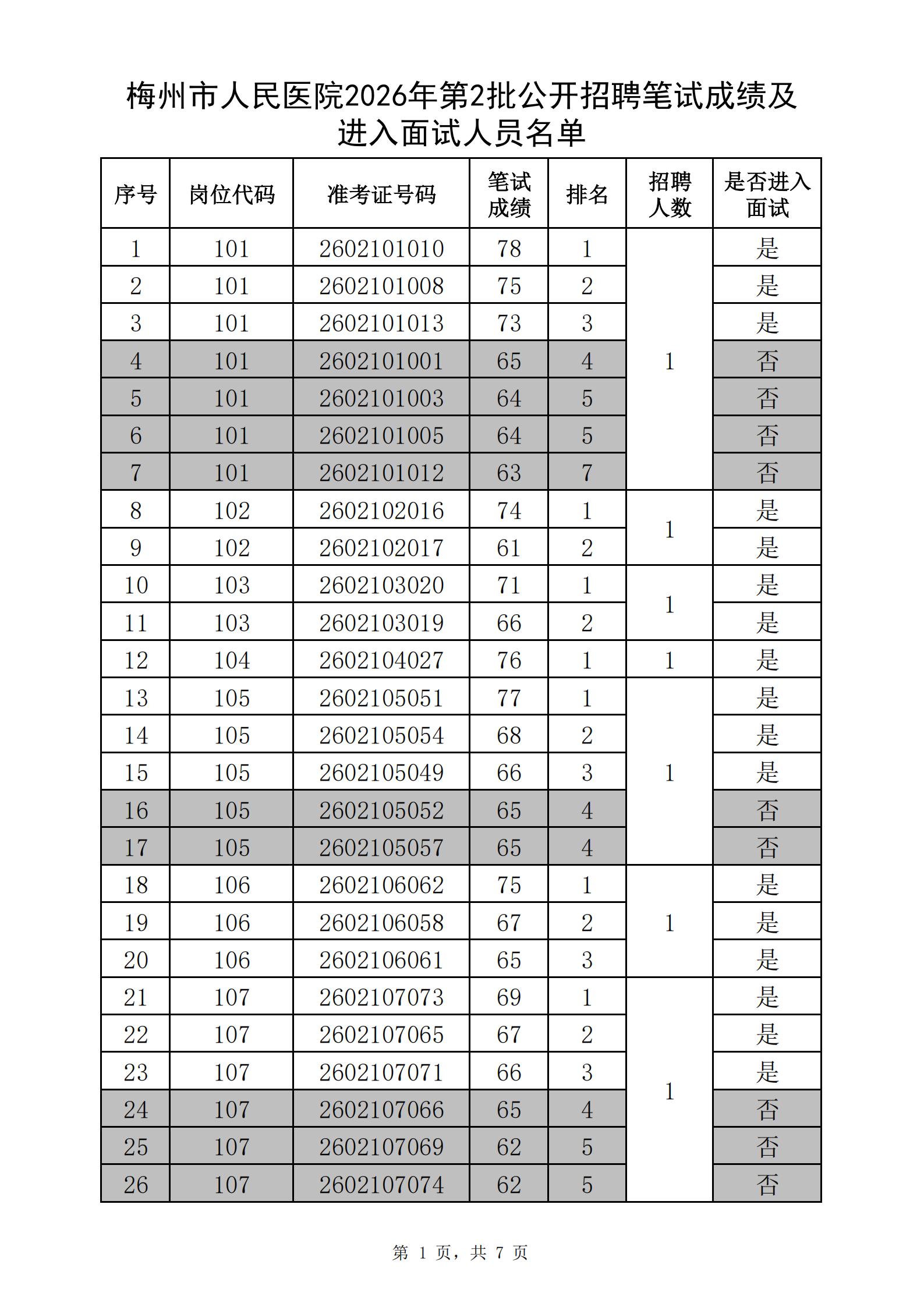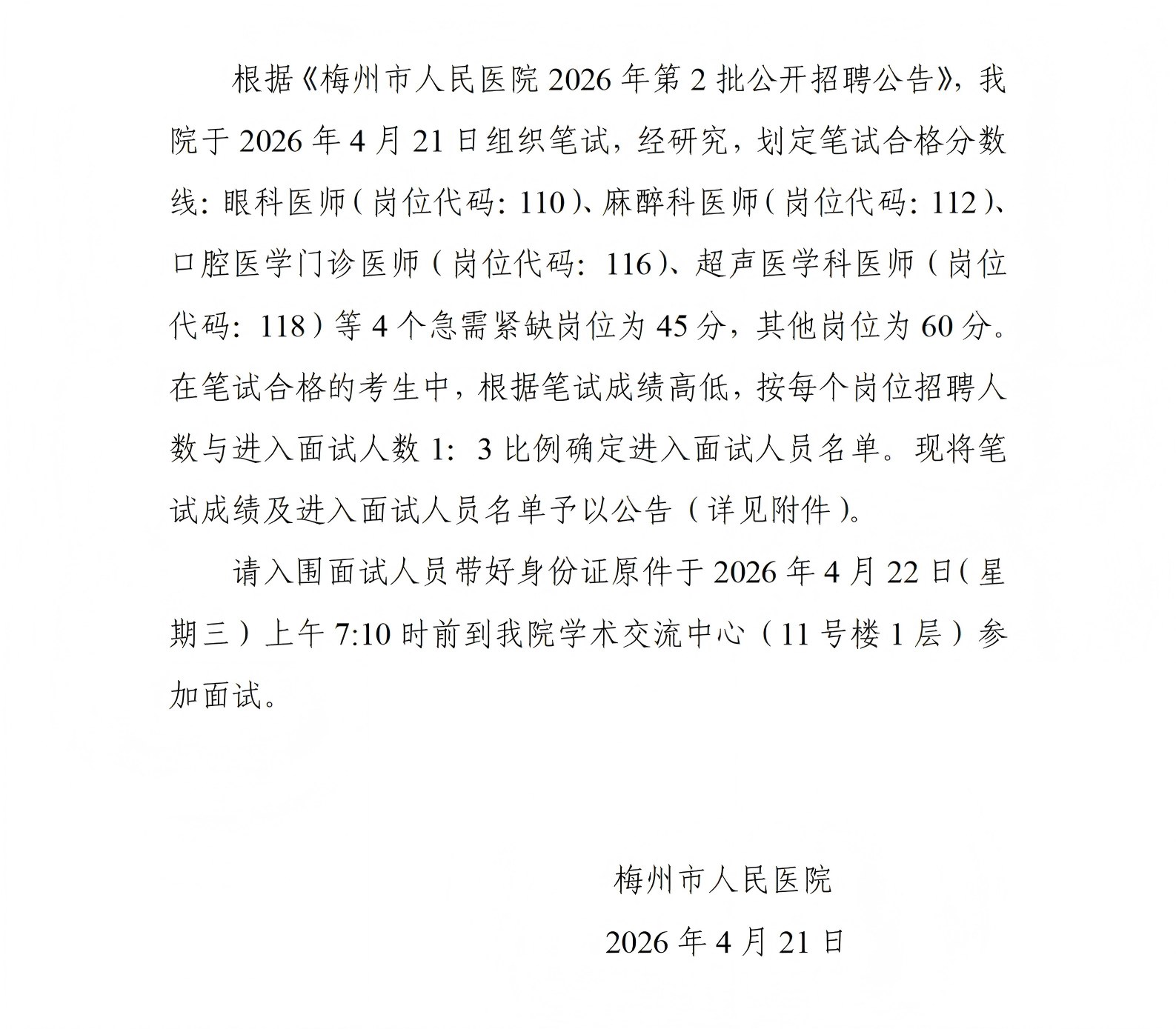 梅州市人民医院2026年第2批公开招聘笔试成绩及进入面试人员名单公告
